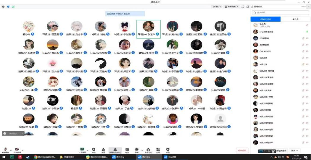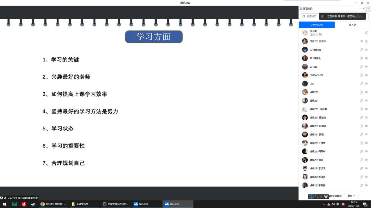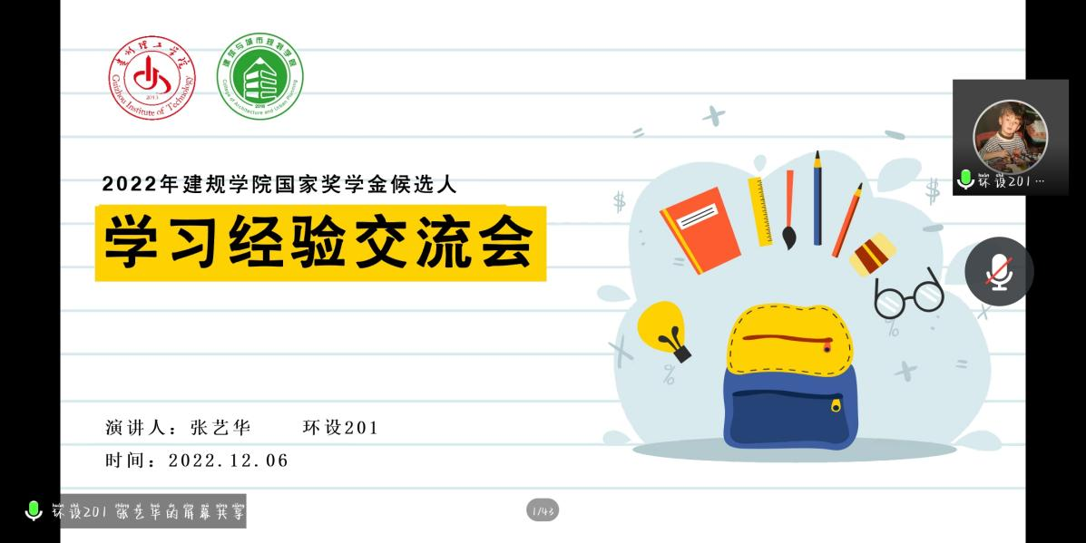 为更好的展现建规学子的优秀风采,充分发挥优秀学生的榜样作用,引领青年勤学奋进、不断进取。我院于2022年12月6日晚在腾讯会议开展国家奖学金候选人学习经验交流会。我院2022级全体同学参加,邀请建规学院本年度获得国家奖学金推荐的环设201张艺华同学进行经验分享,由辅导员杨小岚老师主持。
