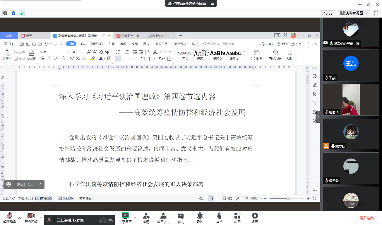 张春艳同志领学了《习近平谈治国理政》第四卷节选内容“统筹推进疫情防控和经济社会发展工作”。她强调,全体党员同志要深入贯彻落实习近平总书记对疫情防控工作的重要指示精神,在疫情防控吃紧阶段,党支部要筑牢战“疫”堡垒,凝心聚力,与全院师生共克时艰,为打赢这场防疫战作出自己的贡献。