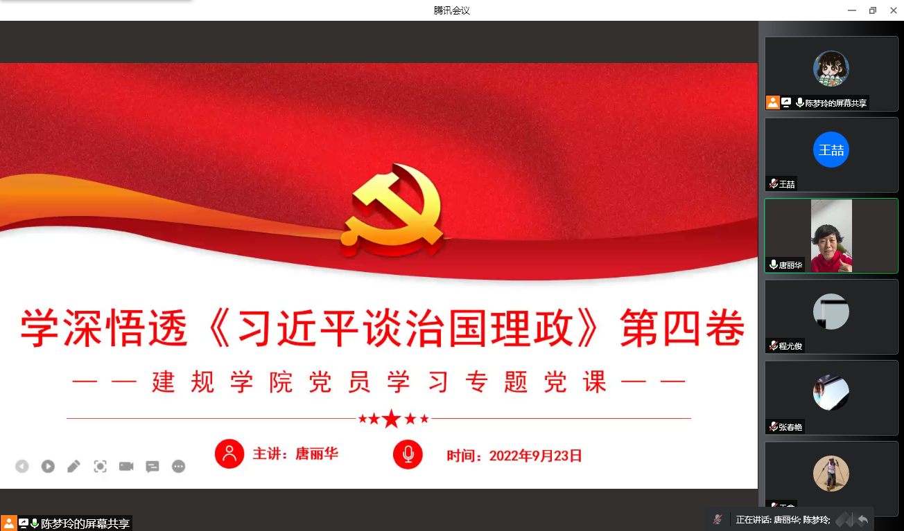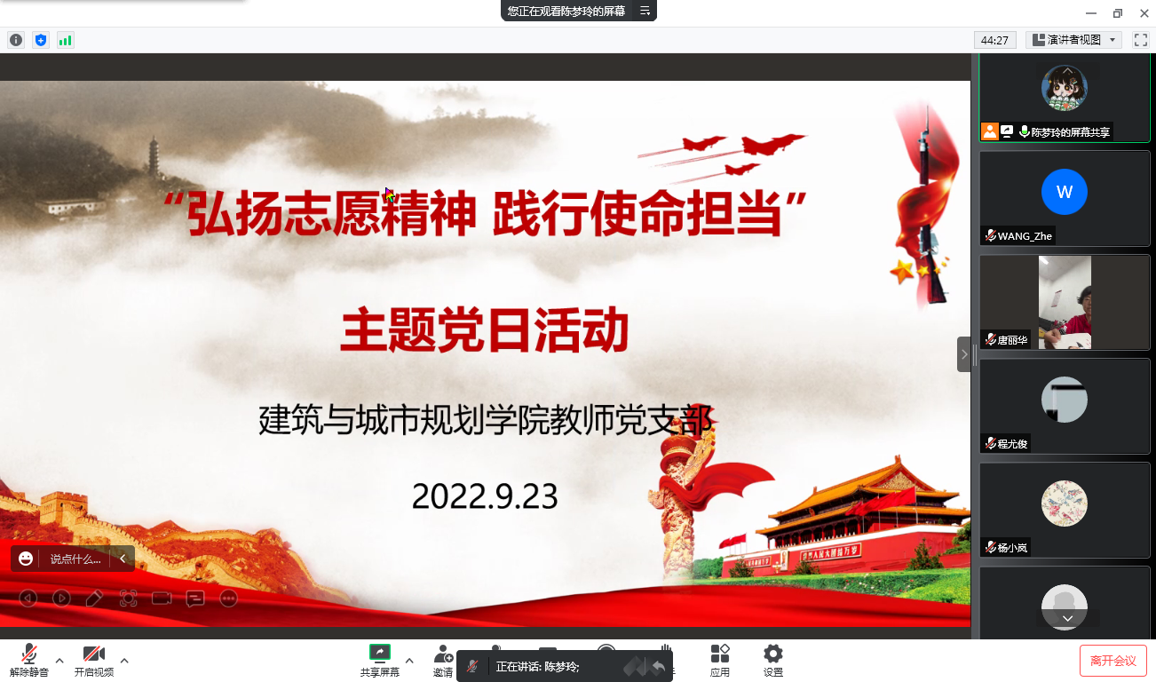 本网讯(建规学院 王喆)2022年9月23日,建筑与城市规划学院教师党支部在腾讯会议平台开展了“弘扬志愿精神,践行使命担当”主题党日活动。活动由教师党支部副书记陈梦玲同志主持,支部全体党员参加。