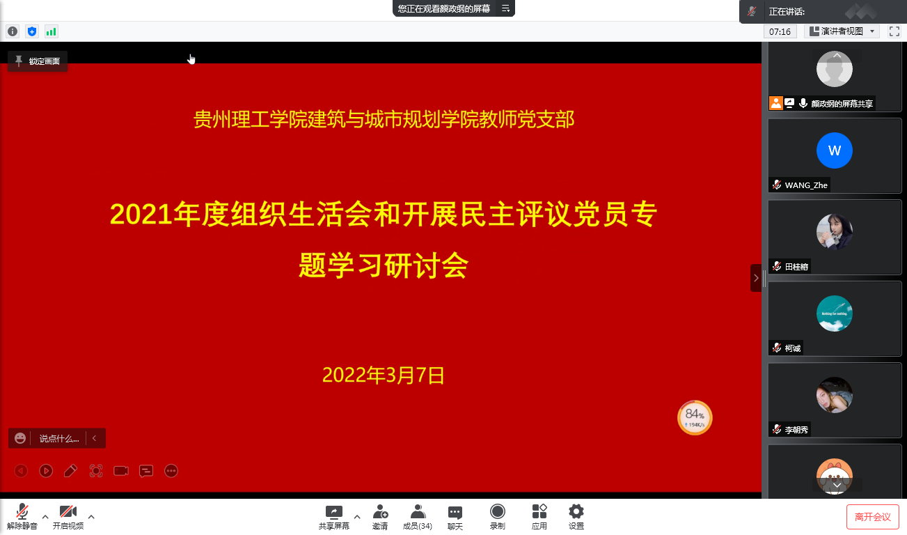 本网讯(建规学院 王喆)3月7日,建筑与城市规划学院教师党支部在腾讯会议平台召开了2021年度组织生活会和开展民主评议党员会前专题学习研讨会。活动由教师党支部书记颜政纲同志主持,支部全体师生党员参加。