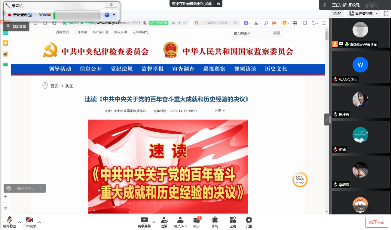 颜政纲同志领学了《中共中央关于党的百年奋斗重大成就和历史经验的决议》,总结了中国共产党自一九二一年成立以来,团结带领全国各族人民为争取民族独立、人民解放和实现国家富强、人民幸福而不懈奋斗走过的一百年光辉历程和所取得的丰富历史经验。