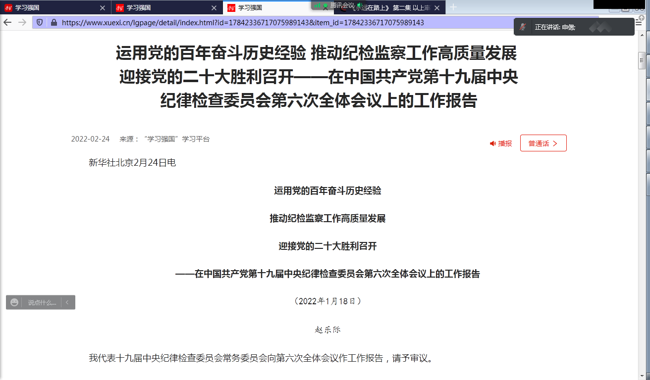 申偲同志领学了《十九届中央纪委六次全会工作报告》。《报告》以习近平新时代中国特色社会主义思想为指导,全面贯彻落实党的十九大和十九届历次全会精神,总结2021年纪检监察工作,部署2022年任务。
