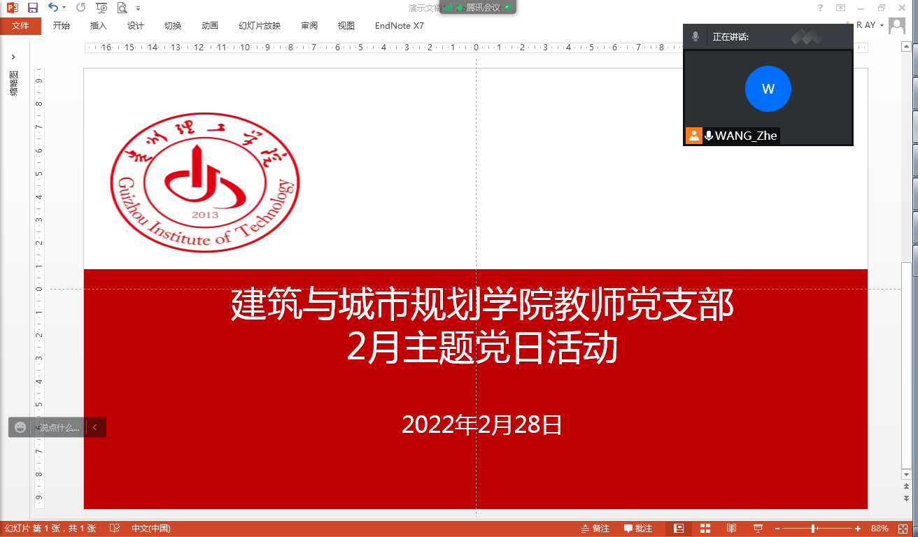 本网讯(建规学院 王喆)2022年2月28日,建筑与城市规划学院教师党支部在腾讯会议平台开展了“运用党的百年奋斗历史经验,推动纪检工作高质量发展,迎接党的二十大胜利召开”主题党日活动。活动由教师党支部纪检委员王喆主持,支部全体师生党员参加。