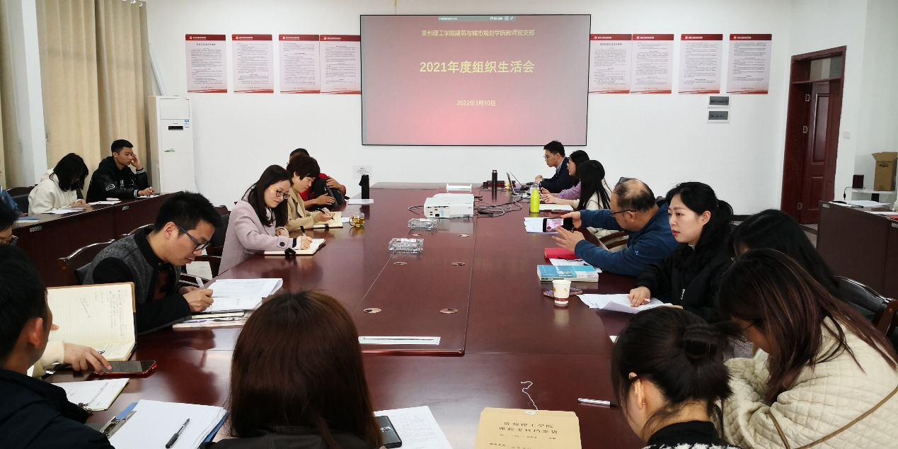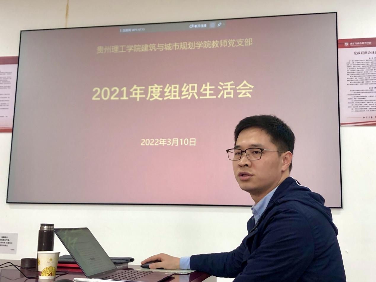 本网讯(建规学院 王喆)3月10日,建筑与城市规划学院教师党支部在贵安校区G3501会议室召开2021年度组织生活会和开展民主评议党员。会议由教师党支部书记颜政纲主持,全体师生党员参加会议,为落实常态化疫情防控要求和结合学院实际工作情况,部分在外开展毕业实习的学生党员和身体原因等不能集中组织参加的教师党员也通过线上同步会议的方式参加。