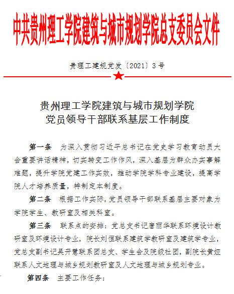 学院党总支出台了《建筑与城市规划学院党员领导干部联系基层工作制度》,学院领导干部以普通党员身份积极参加和主动做好联系基层工作,通过学院领导干部联系教研室、学生会和学生社团工作制度,及时、准确地向联系点做好党的路线、方针、政策和党委政府重大决策的宣传教育,将党的领导融入人才培养全过程;把为师生、为基层办实事好事作为联系基层工作的根本出发点,了解师生所思所想所盼,为师生答疑解难;积极整合优势资源,推动基层难题解决,提升党建工作实效,为学院建设与发展做好服务。