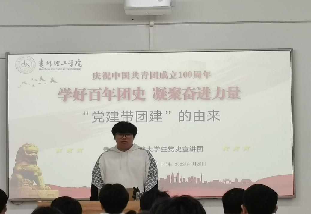 本网讯(建规学院 王旭阳)为庆祝中国共青团成立100周年,大力弘扬五四精神,展示蓬勃向上的青春力量,贵州理工学院大学生党史宣讲团成员、建筑与城市规划学院城规201班王旭阳同学于2022年4月28日晚在G3302教室为智能201班及网络201班全体同学开展主题为“学好百年团史 凝聚奋进力量之党建带团建的由来”的宣讲会。