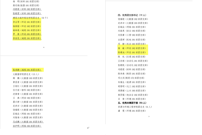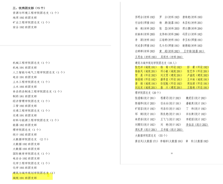 在此次表彰中,城规191 班荣获“优秀团支部”称号;环设192班杨敏、环设181班陈建池荣获“优秀团支部书记”称号;李会琴等6名同学荣获“优秀共青团干部”称号;刘龙发等18名同学荣获“优秀共青团员”称号。