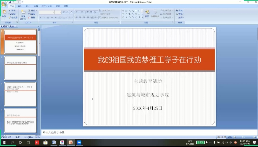 本网讯(建规学院 卢学兰)为积极应对新冠肺炎疫情,坚决打赢这场人民战争、总体战、阻击战,4月25日,建规学院组织学生党员、发展对象及入党积极分子在线上开展“我的祖国我的梦·理工学子在行动”主题教育活动。