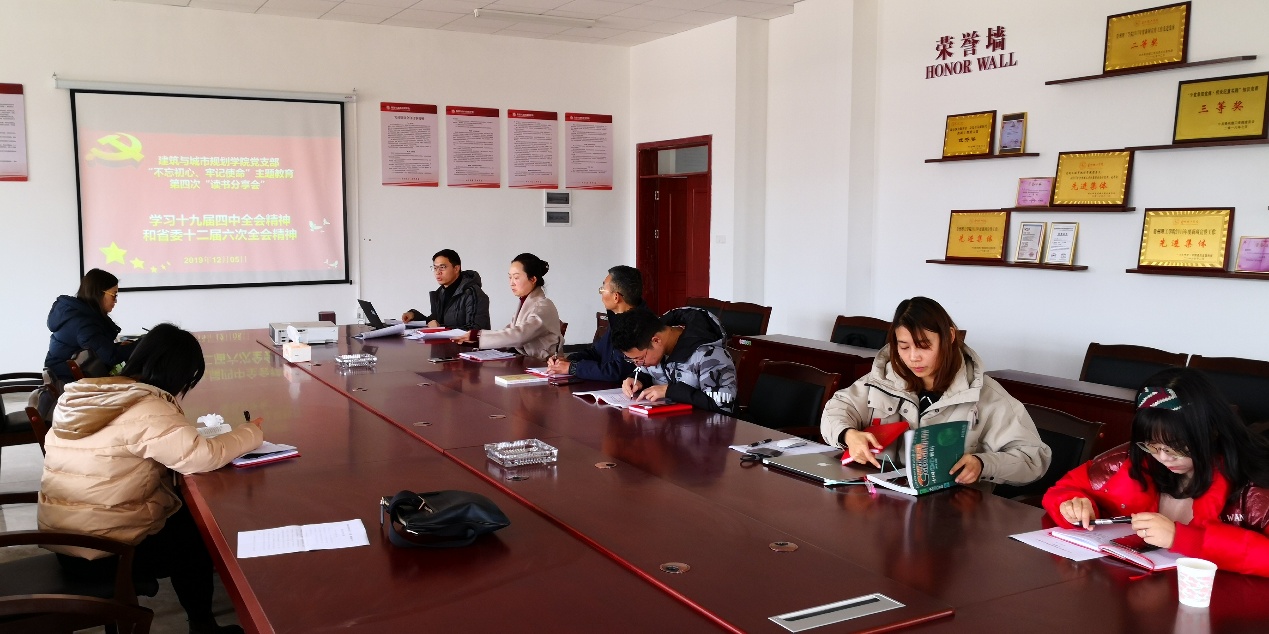 本网讯(建规学院 王喆)12月5日,建筑与城市规划学院教师党支部在贵安校区知行楼G3501会议室举行“不忘初心、牢记使命”主题教育第四次读书分享会。教师党支部书记颜政纲主持会议,支部师生党员参加分享会。
