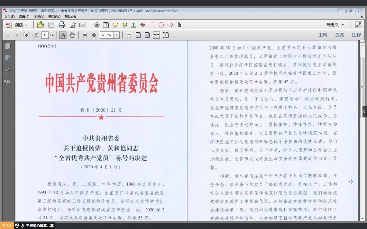 王喆领学习了《中共贵州省委关于追授杨荣、黄和艳同志“全省优秀共产党员”称号的决定》文件精神,并组织观看了《用生命践行初心和使命》先进事迹报道视频。