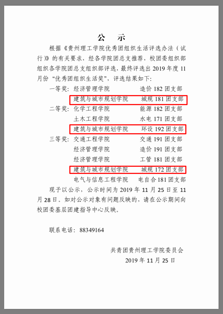 本网讯(建规学院 潘小切)11月22日,在校团委主办的以“我为评估做贡献”为主题的11月团组织生活评比中,我院城规181团支部喜获一等奖,环设192团支部荣获二等奖,城规172团支部获得三等奖。