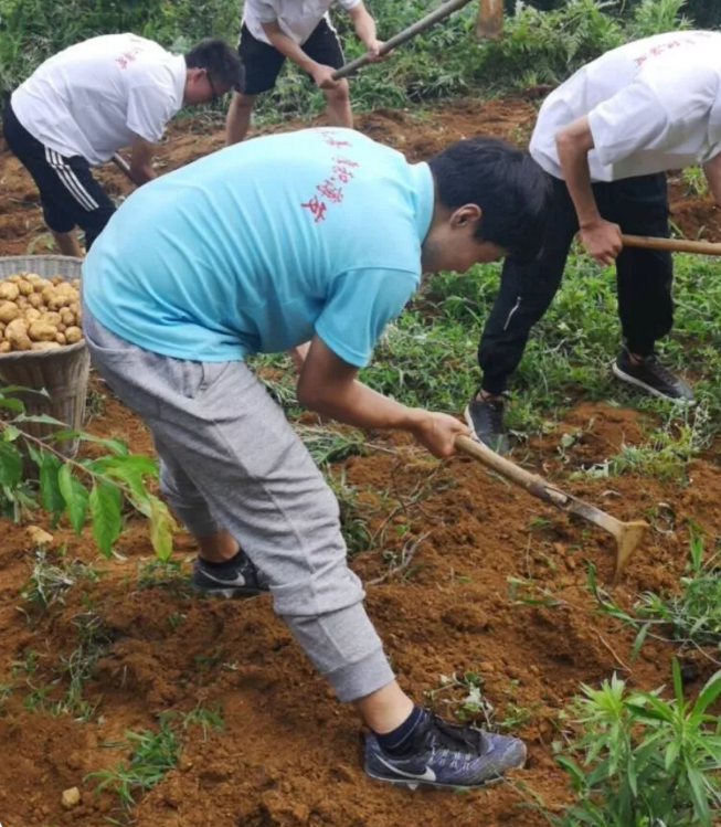 烈日当空,地里热气腾腾。志愿者中有同学从未下过田地,更没有干过农活。在当地农民的指导下,刘芳诚老师带领志愿者们走进地里,挥着锄头开始挖土豆。每一窝土豆都是一串一串的,三五成群地挤在一起。为了避免挖坏土豆,志愿者们必须小心翼翼,一人挖一人捡。很快,大家掌握了劳动方法,背篓里慢慢盛满了土豆。烈日下,志愿者汗流浃背,衣服上也沾满了泥土,但大家在劳动中找到了乐趣,每个人脸上都洋溢着笑容。