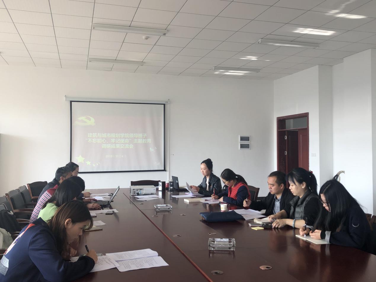 本网讯(建规学院 申偲)11月4日,建筑与城市规划学院领导班子“不忘初心、牢记使命”主题教育调研成果交流会在贵安校区知行楼G3501会议室举行。学院班子成员、教师党支部书记、科级干部、师生代表参加会议,校第三巡回指导组成员钟小勇到会指导,党总支书记张艳主持会议。