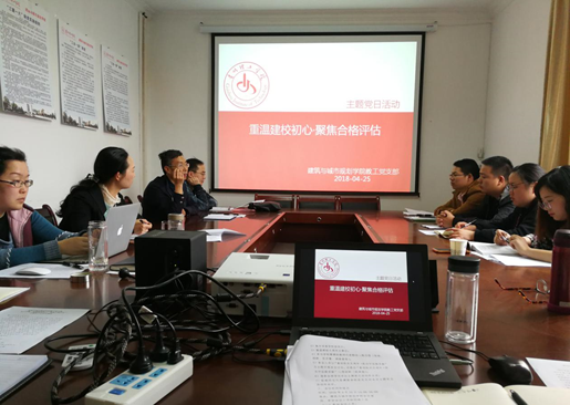 本网讯(建规学院 颜政纲)为进一步深入贯彻落实党的十九大精神,提高运用习近平新时代中国特色社会主义思想武装头脑、指导实践、推动工作的能力和本领,做好迎接教育部本科教学工作合格评估相关准备工作,4月25日下午,按照学校党委组织部的统一要求,建规学院教工党支部在学院会议室组织开展“重温建校初心、聚焦合格评估”主题党日活动。教师党员、教师代表及学生入党积极分子、发展对象等参加活动。