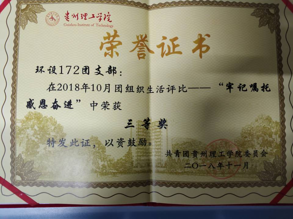 建规学院团总支为贯彻落实《共青团中央改革方案》相关精神,深入实施高校基层团支部“活力提升”工程,努力提升我院团组织活力,积极带动班级团支部建设。环设172班认真开展主题团日活动,继今年10月“牢记嘱托感恩奋进”团组织生活评比获校三等奖后,经过材料申报、现场汇报和答辩环节,再为学院团总支和班级团支部争得贵州理工学院2018年“活力团支部”荣誉称号,使学院团建工作在基层支部落地开花,取得良好成效,这是对我院团建工作的最大肯定。