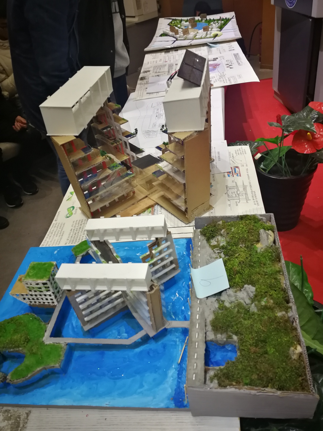 本次大赛要求设计一个主题功能明确的新型概念性社区,该社区须拥有公共建筑、住宅(创意房屋)、道路交通组织、公共服务设施、风景园林等空间设计内容。当晚,12支进入决赛的队伍带着自己的参赛作品模型展开了比拼,通过PPT展示、现场讲解和答辩三个环节,全面阐述参赛作品的设计理念和规划特色。参赛队员个个胸有成竹,侃侃而谈;现场摆放的各种社区模型新颖别致、极富想象,更让观众眼前一亮。