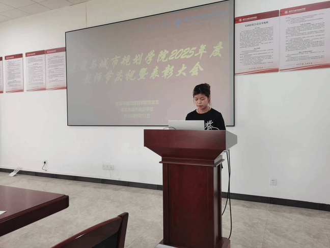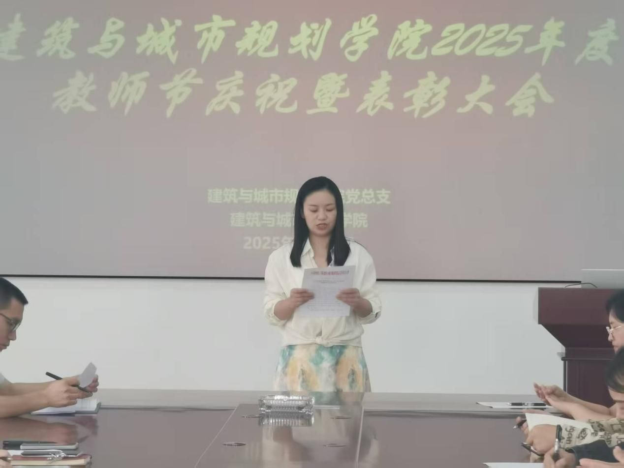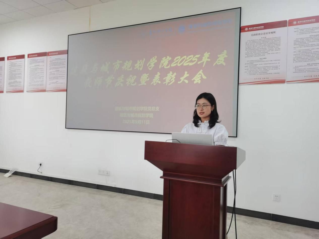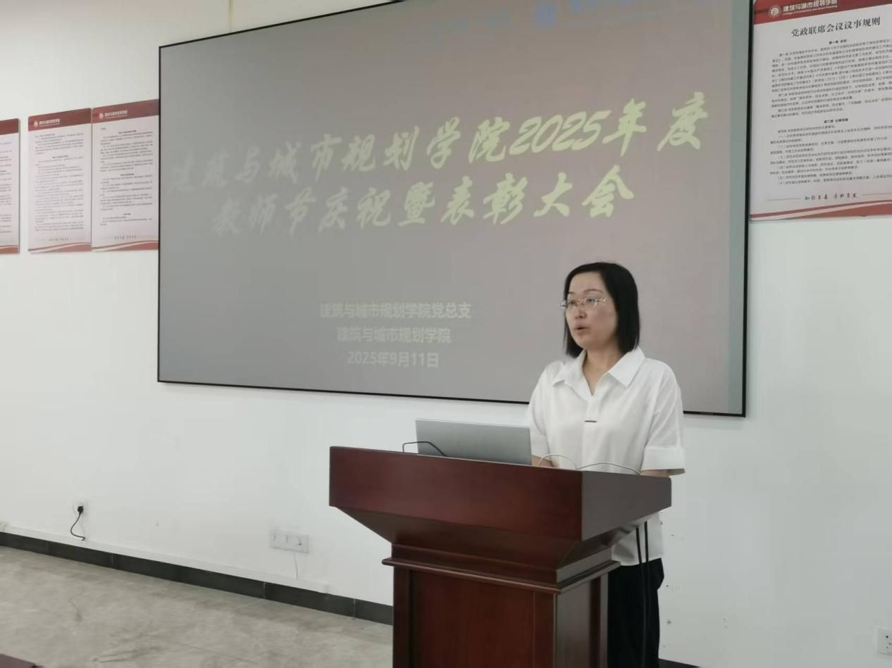 章丽娥副书记宣读《关于表彰建筑与城市规划学院2025年优秀教师、优秀教育工作者的决定》,公布表彰名单,充分肯定获奖者在教学、科研、管理服务等方面的辛勤付出与卓越成绩,希望全院教师以受表彰者为榜样,弘扬和践行教育家精神,潜心教书育人,持续提升教学质量与育人水平,共同推动学院教育事业再上新台阶。
