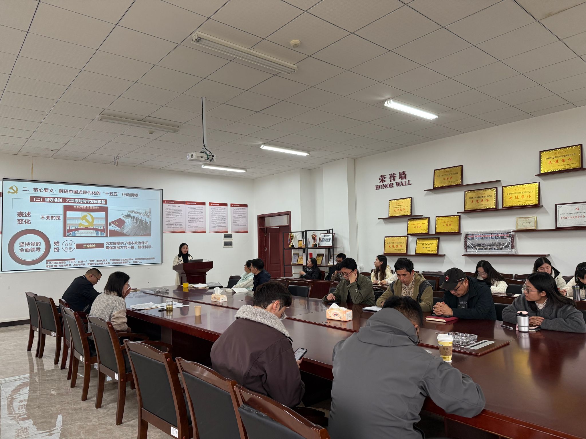 2025年11月6日,我院召开党总支扩大会议,集中学习习近平总书记在党的二十届四中全会上的重要讲话精神、《中国共产党第二十届中央委员会第四次全体会议公报》,解读《中共中央关于制定国民经济和社会发展第十五个五年规划的建议》。学院领导班子成员、全体教职工及学生党员代表参加学习,学院党总支副书记章丽娥主持会议。