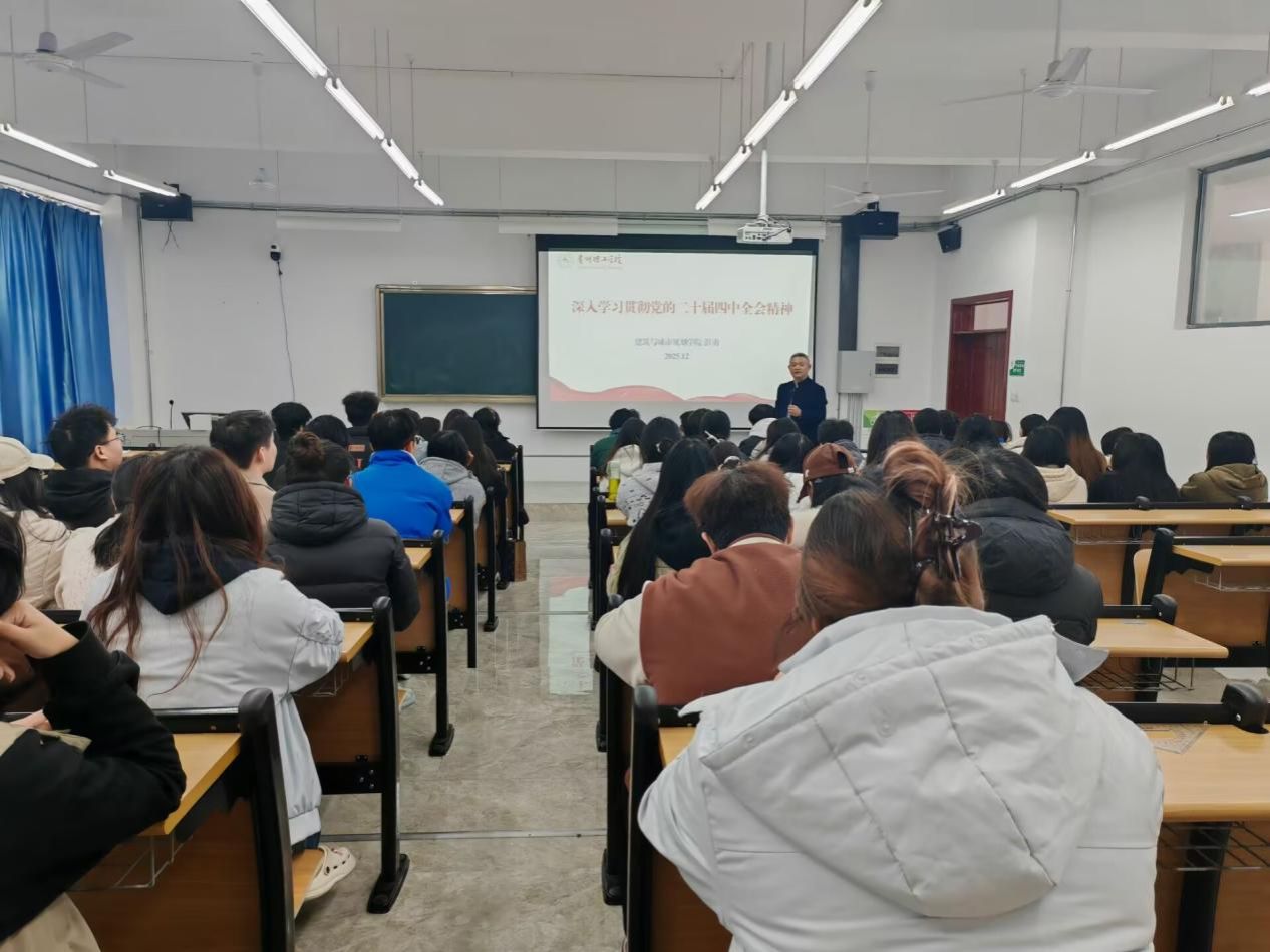 为深入学习贯彻党的二十届四中全会精神,引导广大学生深刻把握国家发展大局与教育使命,2025年12月19日下午,建筑与城市规划学院党总支书记彭勇为全院80余名学生党员、入党积极分子及班委代表作了一场主题鲜明、内容丰富的党的二十届四中全会精神专题宣讲。