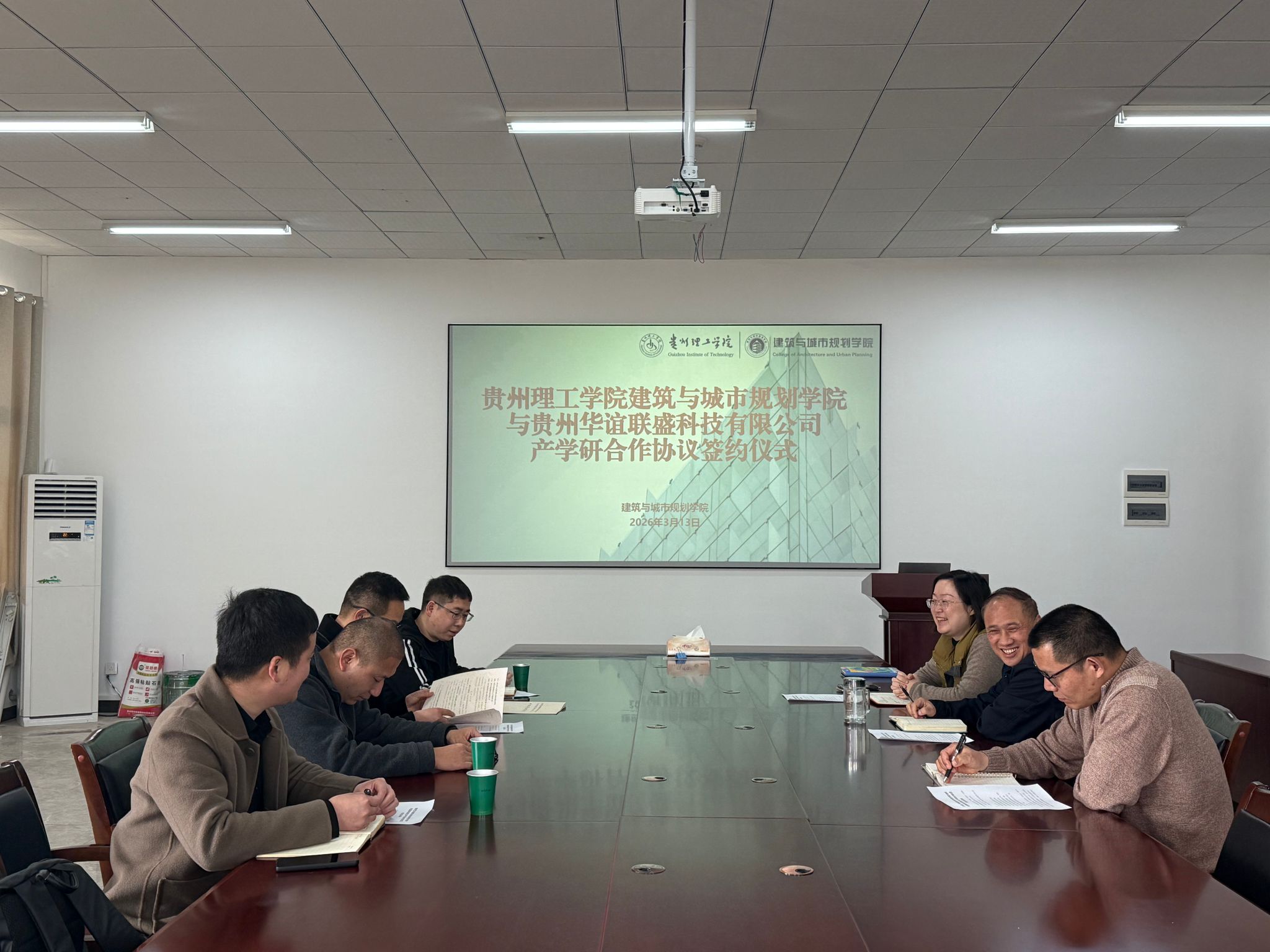 为深化产教融合、强化校企协同育人,推动教育链、人才链与产业链、创新链深度融合,3月13日,贵州理工学院建筑与城市规划学院与贵州华谊联盛科技有限公司产学研合作协议签约仪式在学院会议室顺利举行。贵州华谊联盛科技有限公司总经理郭东升、杨挺、张东,贵州理工学院建筑与城市规划学院党总支书记吴维义、院长黄娅等双方相关领导出席仪式。
