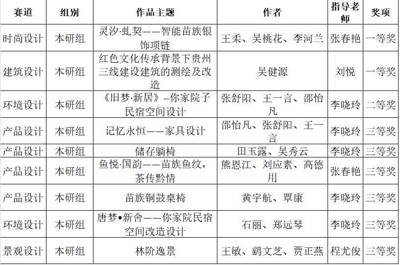 本次大赛作为国内设计教育领域的高水平赛事,吸引了全国众多高校师生参与。贵州赛区竞争激烈,我院师生作品以其独特的设计理念、扎实的专业功底和鲜明的文化特色赢得评委高度认可。获奖作品涵盖建筑设计、时尚设计、环境设计、产品设计、景观设计等多个方向,体现了学科交叉融合的创新实践,也彰显了我院“以赛促学、以赛促教”的教学理念。