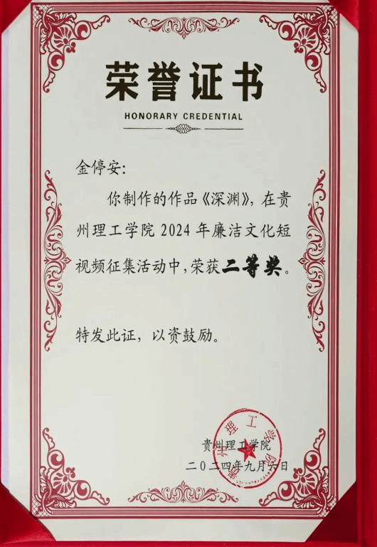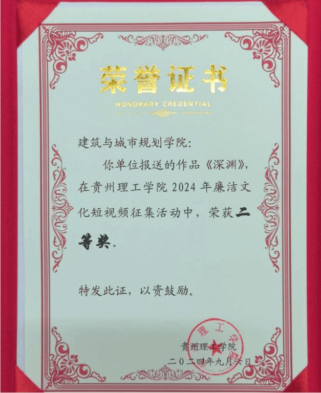 近日,在贵州理工学院2024年廉洁文化短视频征集活动中,建筑与城市规划学院思成融媒体中心金停安同学提交的精心制作的作品《深渊》荣获二等奖,生动展现了建规学院学生对廉洁文化的深刻理解和创意表达。