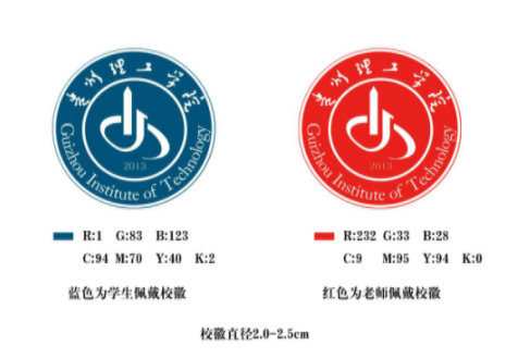 徽志为正圆形,颜色以红色为基础色调,由“贵州理工学院”英文缩写“GIT”为基本元素组合构成并进行创意变形;“G”、“I”、“T”构成类似“地球轨道”或“分子轨道”的图形,体现了贵州理工学院以理工科为核心的学科特征,“I”变形成向上喷发的火箭,体现了贵州理工学院发展航空航天特色学科专业和师生积极进取、拼搏向上的精神风貌;“G”、“I”、“T”字母组合成“西”字,体现了贵州理工学院将开拓奋进,努力实现省委、省政府提出的“建设西部一流理工科大学”的宏伟目标。
