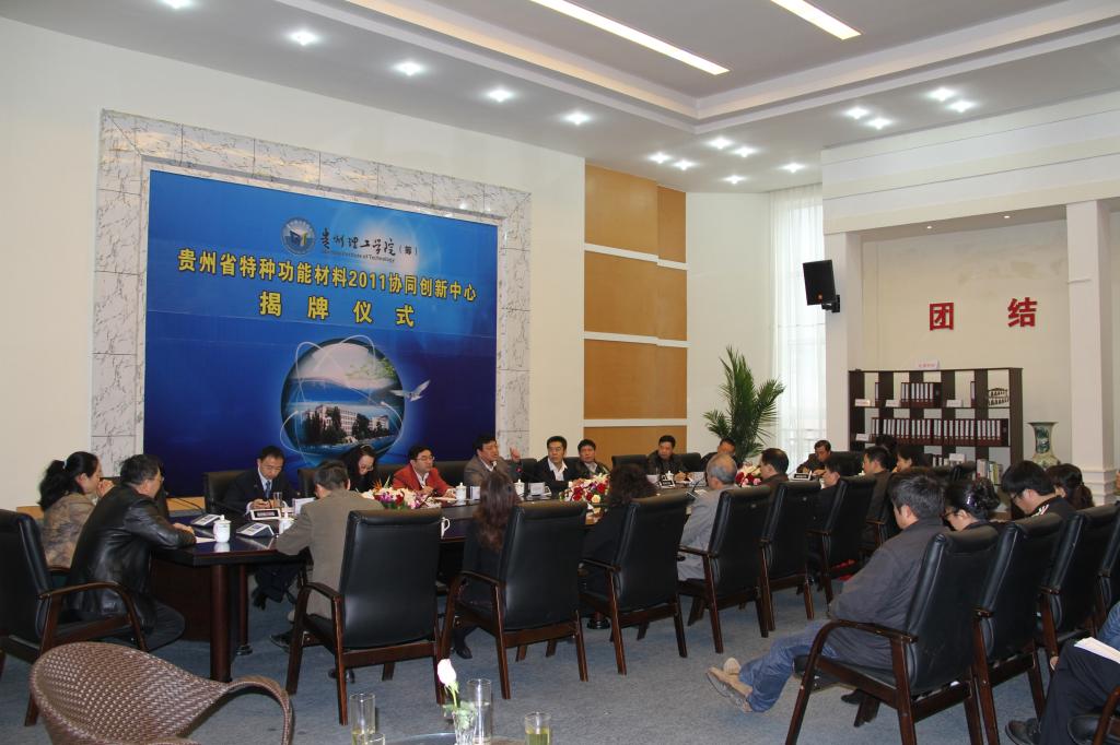 2012年11月14日上午10:00在喀斯特三楼会议室,举行了我校“贵州省特种功能材料2011协同创新中心”揭牌仪式,会议由贵州省教育厅科研与研究生教育处熊星处长主持。