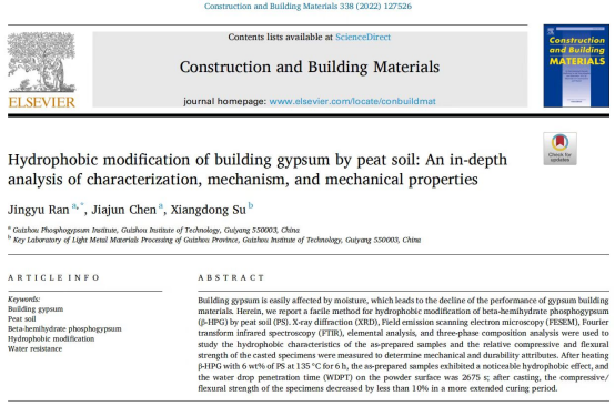 石膏建材化利用领域的最新研究成果(Hydrophobic modification of building gypsum by peat soil: An in-depth analysis of characterization, mechanism, and mechanical properties. Construction and Building Materials, 338 (2022) 127526)。