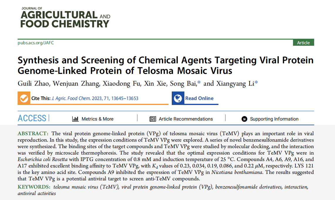 日前,贵州理工学院化学工程学院赵贵丽以第一作者身份在国际顶级期刊《Journal of Agricultural and Food Chemistry》(TOP期刊,中科院1区,影响因子IF=6.3)上发表题为《Synthesis and Screening of Chemical Agents Targeting Viral ProteinGenome-LinkedProtein of Telosma Mosaic Virus》研究论文,并被Web of Science数据库检索。