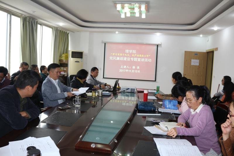 (理学院 王姣 报道)11月13日下午,理学院在行政楼825会议室开展“学习宣传十九大,全面从严治党在心中”党风廉政建设专题宣讲活动,活动由学院教务科负责人、学校党风廉政监督员徐滨老师主讲,理学院全体教职工认真聆听了宣讲报告。