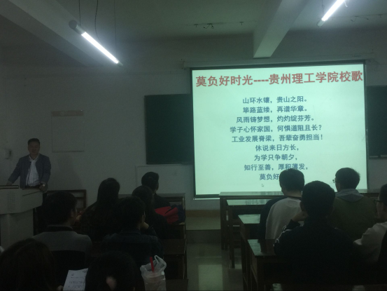 作为校歌歌词作者,活动伊始,袁小松书记就我校校歌《莫负好时光》的歌词含义向同学们作了详尽的介绍。袁书记深情地说,校歌的歌词创作是以我校的成立和发展为背景,歌词的开头“山环水镶,贵山之阳。筚路蓝缕,再谱华章”,道出了贵州理工学院的地理位置,展示了我校明媚、动人的自然风光和育人环境,再现了学校筹建、创建的艰辛历程,抒发了理工人艰苦创业的豪情壮志和对学校培养桃李、塑造栋梁之才的无限期待,意在勉励学生们能够志存高远。歌词不仅融入了我校校训“知行至善,厚积薄发”,还提出了“休说来日方长,为学只争朝夕”的话语,勉励学生珍惜大好时光,学习必须分秒必争,学习中也需将知识与实践结合,一个“工业发展脊梁”也道出了我们作为理工学子的责任与担当。歌名“莫负好时光”则饱含了学校对全体学生的无限期许和深情希望。