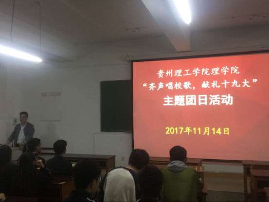 (理学院统计171班 舒雪 报道)金秋绚丽,党徽耀眼,中国共产党第十九次全国代表大会在北京胜利召开。为进一步学习宣传贯彻党的十九大精神,团结凝聚全院团员青年进一步坚定“永远跟党走”的信念和决心,理学院2017级全体学生于11月14日晚19时在三教414教室开展了以“齐声唱校歌,献礼十九大”为主题的团日活动。院党总支副书记袁小松来到教室,教唱校歌,一起带领大家用昂扬奋进的歌声向党的十九大献礼。