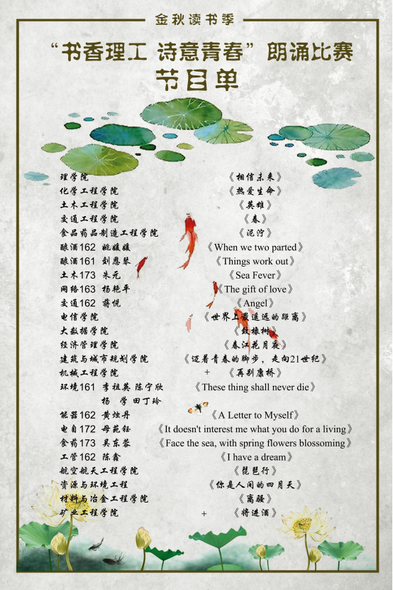《相信未来》、《热爱生命》、《春江花月夜》、《琵琶行》、《These thing shall never die》、《When we two parted》等一首首诗歌从选手们的口中激昂、飞扬地朗诵出来,在展示他们个人风采的同时,也体现了当代大学生对诗词的关注与思考,更是突出了选手们在中、英文朗诵方面的天赋,铿锵有力的语调、得体大方的姿态,赢得了评委们的一致好评。