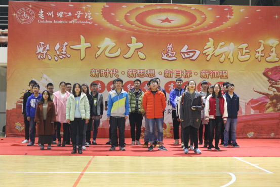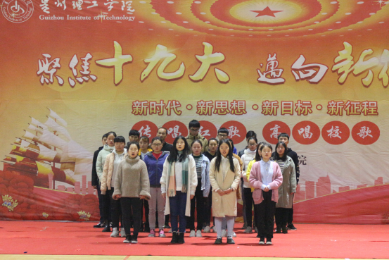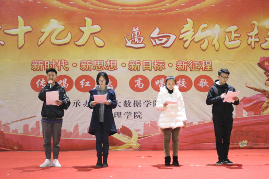 (理学院统计173班 田莉 报道)为进一步深入学习、宣传和贯彻党的十九大精神,传承红色基因,不忘赤子初心,更加团结凝聚大学生为实现中华民族伟大复兴的中国梦而努力奋斗。11月20日晚七时,理学院与大数据学院以“聚焦十九大,迈向新征程”为主题在校体育馆联合举办了一次青春洋溢的传唱红歌、高唱校歌合唱活动。