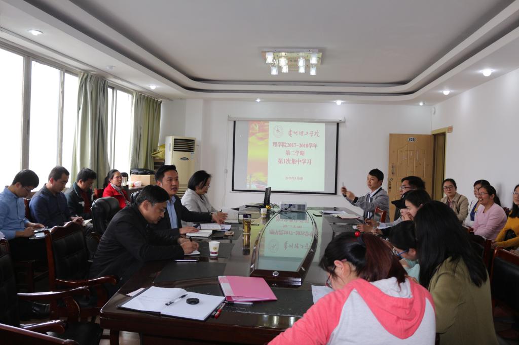 (理学院 张梦 报道)2018年3月4日下午,贵州理工学院理学院在8楼会议室举行2017—2018学年第二学期第一次教职工集中学习,副院长李智玲、王春江及理学院全体教职工参加学习,会议由理学院党总支副书记袁小松主持。