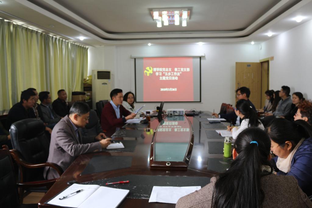 (理学院 王大飞 报道)按照校党委组织部《关于开展学习“五步工作法”主题党日活动的通知》(贵理工组通[2018]4号)文件要求,为进一步提高学院党组织运用“五步工作法”科学思想方法指导实践,不断提升工作的能力和本领,理学院党总支高度重视,于3月26日举行主题党日活动,认真开展了对“五步工作法”相关内容和精神的学习。党总支副书记袁小松主持党日活动,全体教工党员参加党日活动,根据工作需要,活动扩大到全体教职工参加。