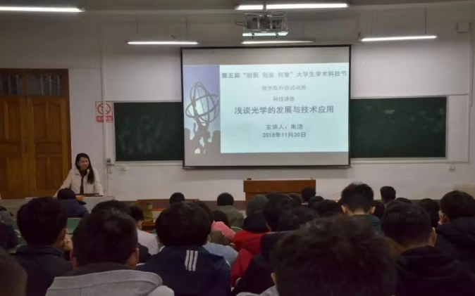 开幕活动上,理学院朱洁博士为同学们带来了主题为“浅谈光学的发展与技术应用”的精彩讲座,这也是理学院“致用讲坛”的第四讲。朱洁博士首先通过介绍光学的历史,带领同学们一步步走进光学的世界,由复杂的光学知识到身边的实例,深入浅出的为同学们解开了光学的面纱,并使同学们意识到了“科技改变历史,知识改变命运”。