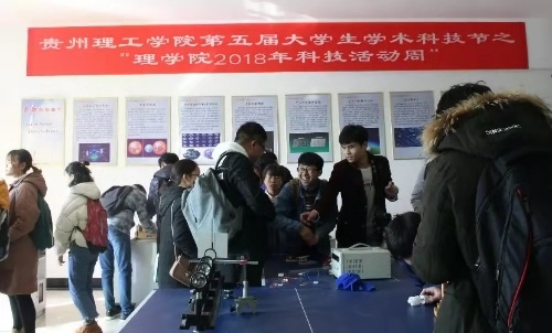 (理学院 陈树晖 报道)进一步弘扬科技创新精神,传播科学知识,增进大学生对科学技术的理解和认知,培养学生的创新精神和专业能力,由校团委、双创中心联合主办,理学院承办的贵州理工学院第五届大学生学术科技节之“理学院2018年科技活动周” 集中展示于2018年11月23日上午10点在第三实验楼理学院实验室中厅顺利开展。来自我校各个学院的诸多同学如约而至,参与科技节活动现场体验。