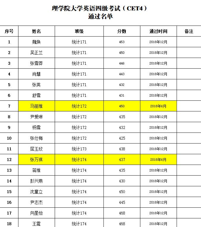附:截止2019年2月,理学院通过大学英语四级考试学生名单