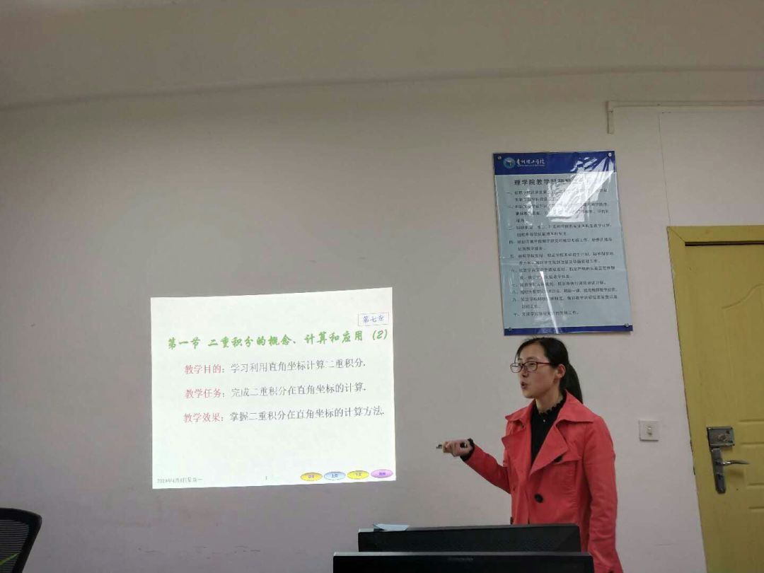 首先,老师们集体对《二重积分的概念、计算与应用》这节课进行研讨,以什么例子进行引入,以什么方式启发学生对比定积分概念得出二重积分的概念,以什么形式介绍二重积分概念。大到PPT的制作,小到课堂上每一句话的表述,大家都进行了详细的研讨。老师们也大胆尝试并应用新的教学方式,对以往教学方式进行改革,积极利用雨课堂进行教学。教师在学生的学习过程中应努力起到引路人的作用,教学活动中要充分调动学生的积极性。老师们也一致认同,在苦练内功的同时,也应注意自身的言谈举止,把自己最美的形象展示给学生,不止数学很美,数学老师更美!