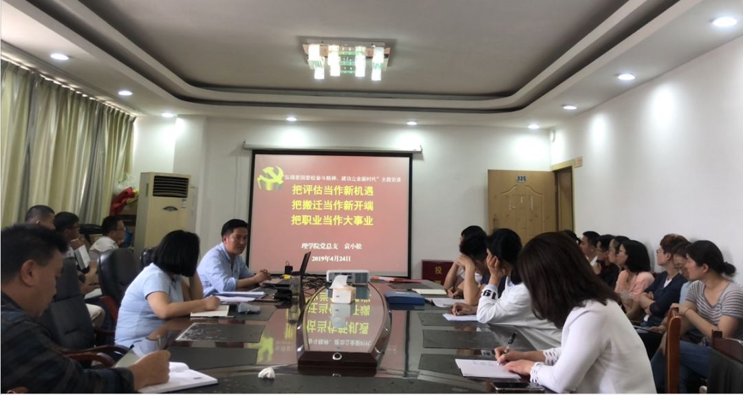 (理学院 张世功 报道)按照学校统一部署,2019年4月24日,理学院党总支及理学院教师党支部在行政楼825会议室开展了主题为“‘祖国在心中·与校共成长·同心迎评估’聚力本科教学工作合格评估”的主题党日活动。在党日活动中,袁小松书记为全体教职工上了一次以“弘扬爱国爱校奋斗精神、建功立业新时代”为主题的党课。