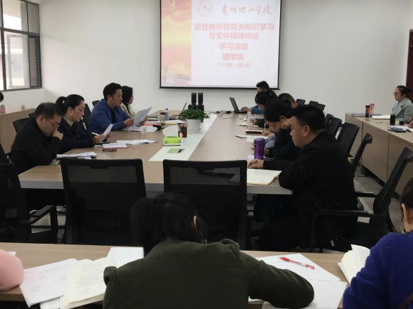 为顺利完成我校本科教学合格评估工作,11月2日14:30,理学院在贵州理工学院贵安校区知行楼五楼理学院会议室召开集中学习会议。