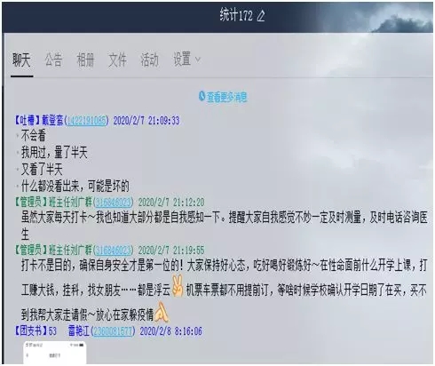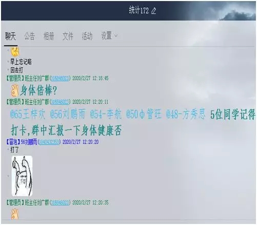 这时你才会发现,这个“甲”,居然是理学院统计172班的班主任刘广群老师。在这个疫情笼罩下的统计172班QQ群里,没有恐慌,没有阴暗,却随时充满着阳光、幽默与乐观的气息。