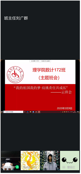 3月10日上午9点40分,统计172班召开了开学以来的第一次主题班会,本次班会以网络云班会的形式召开,由172班班主任刘广群主持,班级导师、理学院党总支书记袁小松也应邀参与了本次班会。