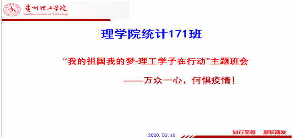 为积极应对新冠肺炎疫情,坚决打赢这场人民战争、总体战、阻击战,响应学校号召,围绕立德树人根本任务,落实以“我和我的祖国”为主题,在疫情期间做好大学生思想政治教育的通知精神,理学院统计171班全体学生于2020年3月18日下午16:00通过网络会议,召开了“我的祖国我的梦-理工学子在行动”主题班会。