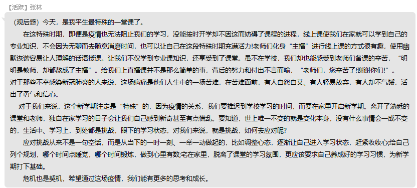 每一个故事,都有动人心弦的感动!感悟一件事的过程中,大家一起回顾了很多在抗疫一线的工作人员,正因为有他们的坚守和努力,我们才得以岁月静好,他们是这个时代最可爱的人,同学们也在这次活动中更加坚定了奋斗的信念!