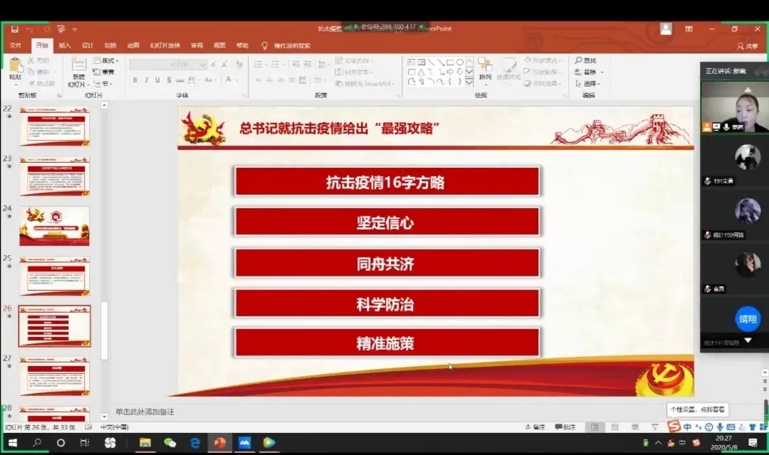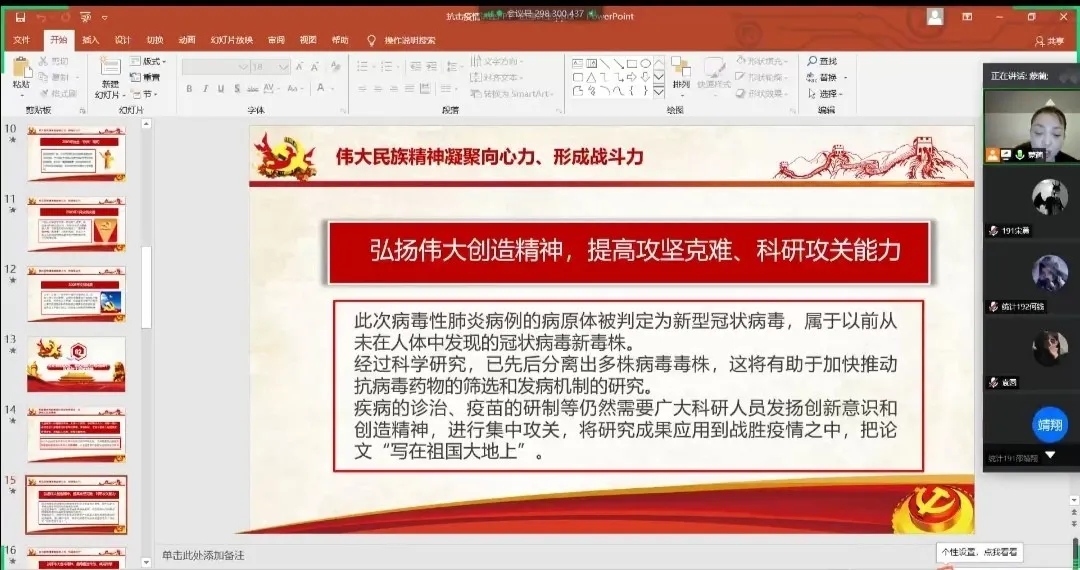 讲座伊始,蒙书记播放了抗疫短片《加油,我的国》,将同学们的思绪引入其中。讲座中她说道:“此次疫情牵动着无数国人的心,在这关键节点上,全国人民必须坚决贯彻落实习近平总书记重要讲话、重要指示精神,坚定信心、同舟共济、科学防治、精准施策,弘扬中华民族的伟大民族精神,增强向心力、凝聚力和战斗力,切实维护人民群众生命安全、维护社会大局稳定,坚决打赢疫情防控阻击战。”