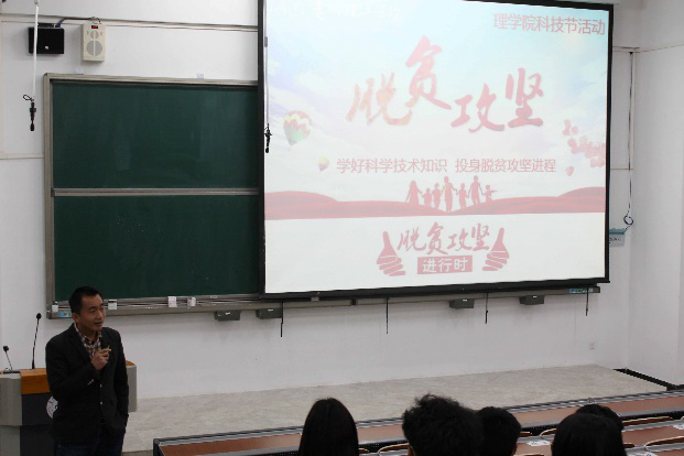 张世功老师结合中央脱贫攻坚的相关方针政策等向大家展示了贵州理工学院近年来取得的脱贫攻坚成就。他从介绍“春风行动”开始,强调了学校领导对脱贫攻坚工作的重视,各级部门积极投身脱贫攻坚进程,帮助农民将新鲜蔬菜送到贵州理工学院教师和学生的餐桌上,给漆黑的乡村道路装上新型太阳能路灯,改善了农民的生活状况。然后,张世功老师又介绍了理工学院脱贫攻坚工作中的科技元素,从小型山地多功能水稻收还一体机到无人机智能播种,从科学病害防治到微波辅助茶叶杀青等,同学们惊呼脱贫攻坚中的理工“黑科技”,为这些“黑科技”中包含的理学院智慧感到骄傲。