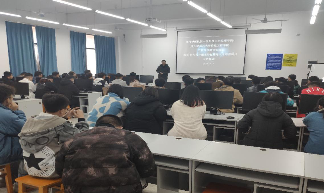 项目介绍:戴尔—贵阳软件服务外包项目是贵阳市市政府的招投标项目,计划3年内为戴尔公司在贵阳的生产基地提供大约500人的软件人才,该项目委托贵州博源讯领科技教育有限公司对人才进行培育,培育六个月后定向到企业工作。前期,学院领导老师与该公司及相关的同学进行了深入的沟通交流,做了大量的工作,最后才得以顺利与贵州中医药大学信息工程学院的同学联合开班。